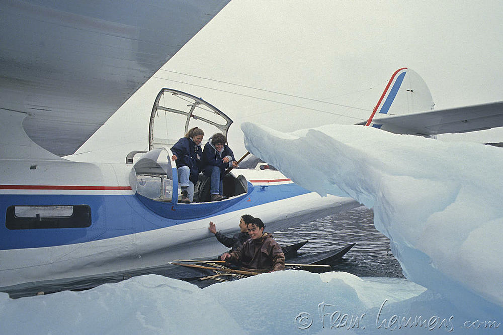 Greenland, Qaqortog, Catalina PBY-5A hydroplane and local boys in dug out canoe. Peter Stuyvesant Travel Odyssey 1993/1994.